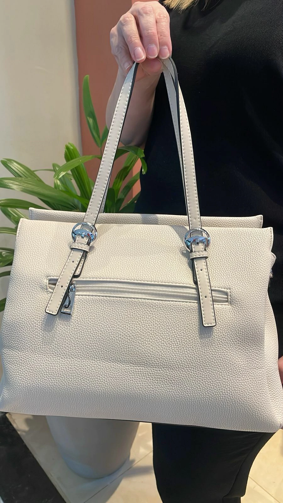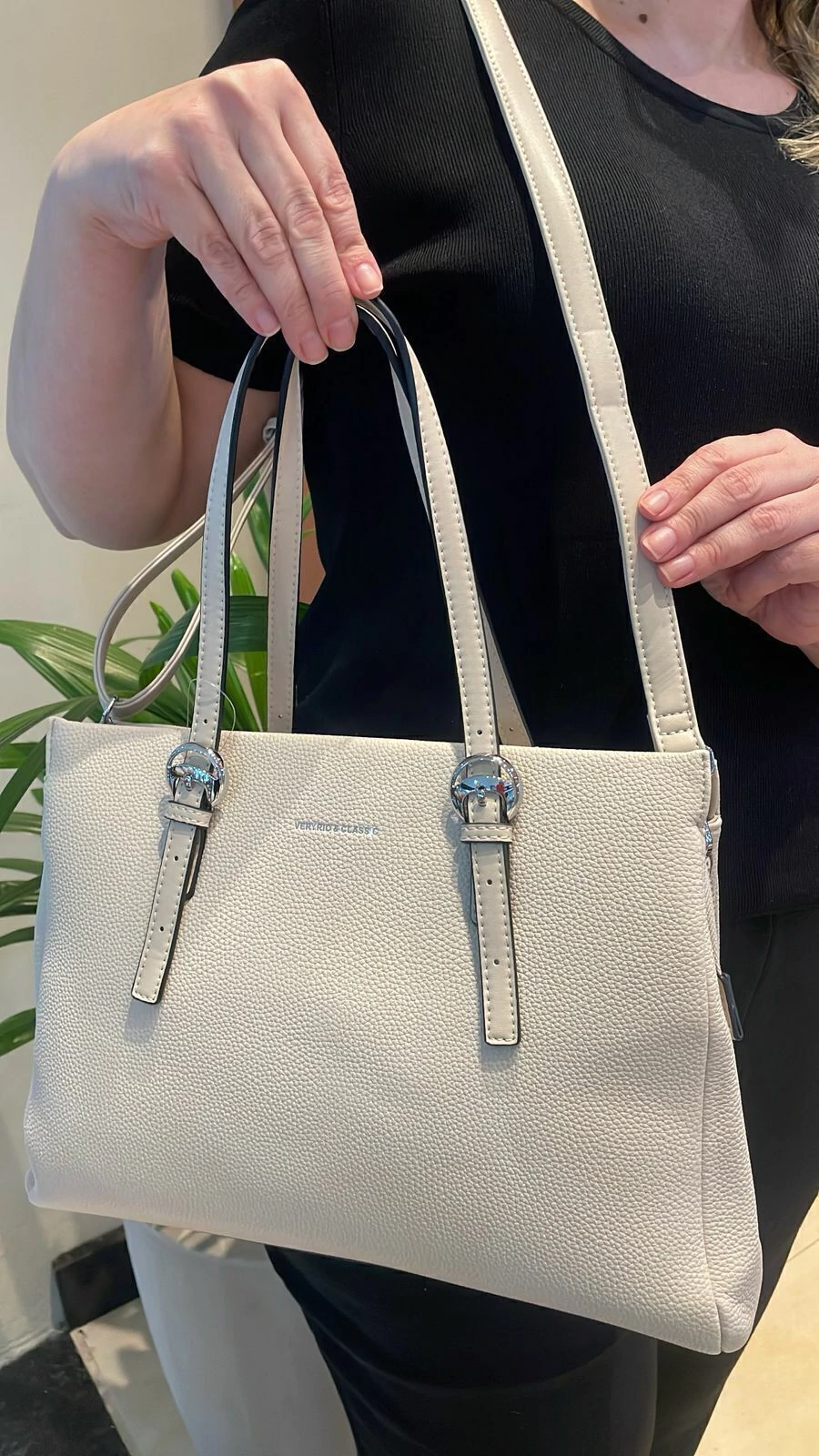 Os detalhes em metal na cor ônix, de primeira linha, trazem um acabamento sofisticado que não oxida, garantindo brilho e elegância por muito mais tempo. A alça de ombro possui regulagem para uso mais curta ou longa, além de uma alça transversal removível, que permite versatilidade e conforto.