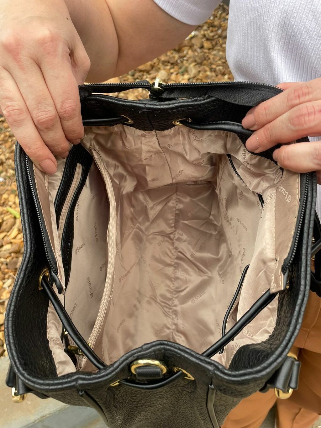 Bolso interno com zíper + bolso aberto para chaves, batons e objetos menores