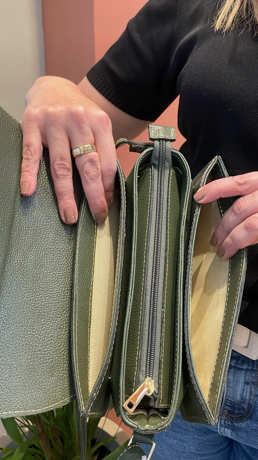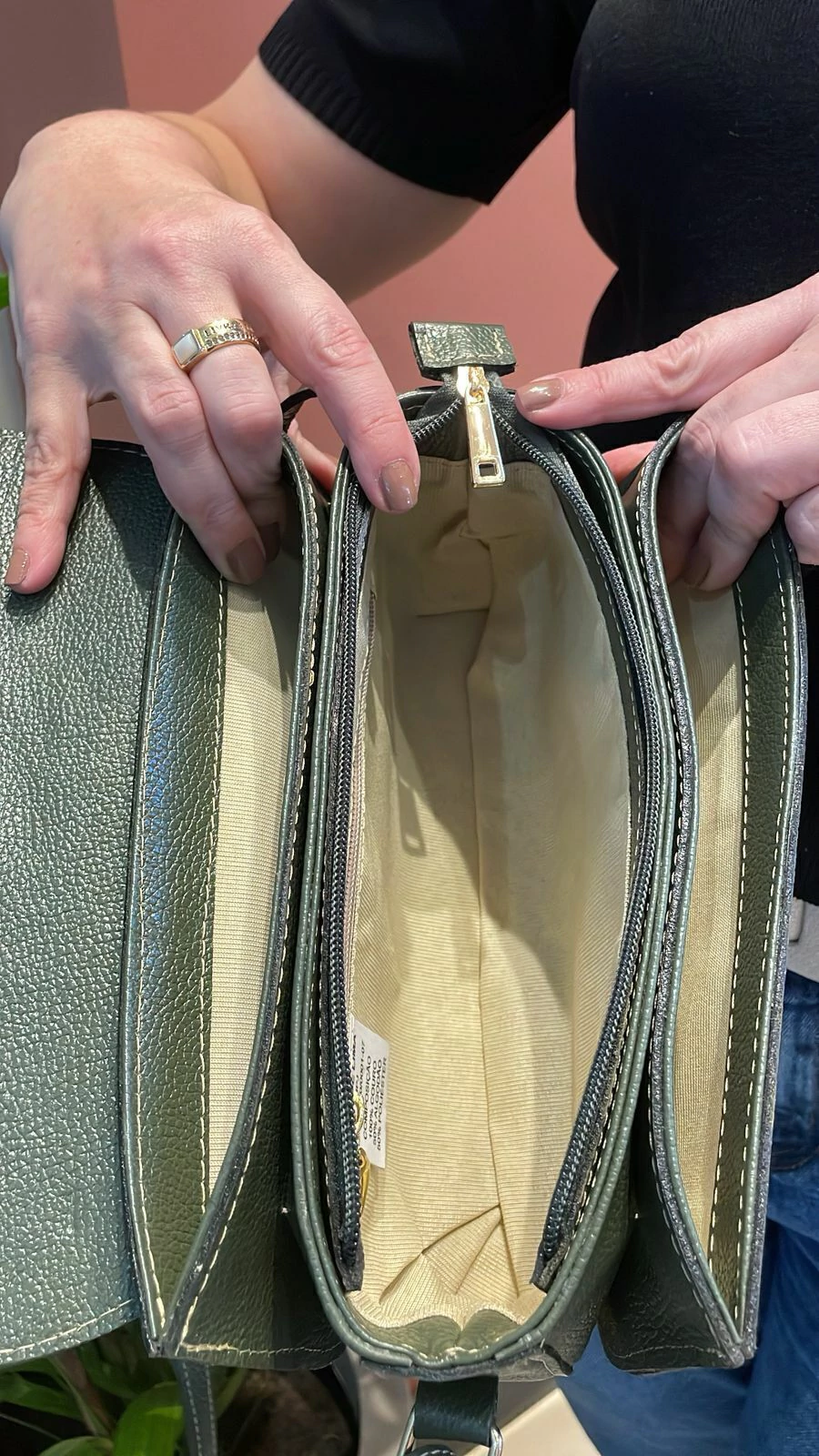 Apesar do tamanho compacto, a Angelina surpreende com três divisórias internas, sendo uma com fechamento por zíper. Dentro dela, há ainda um bolsinho com zíper, ideal para guardar pequenos itens com segurança.