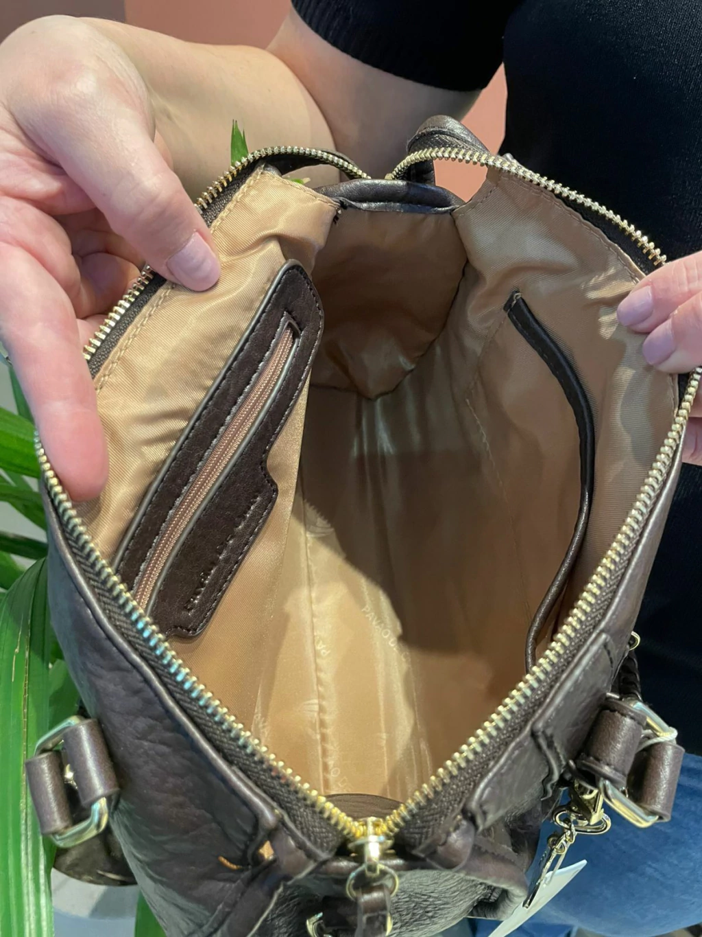 O fechamento principal é em zíper, garantindo segurança, enquanto a parte interna oferece bolsinho com zíper e bolso aberto para itens menores. Na parte frontal, detalhe decorativo e bolsinho com zíper para objetos como batom, e na parte traseira, bolso externo com zíper para acesso rápido.