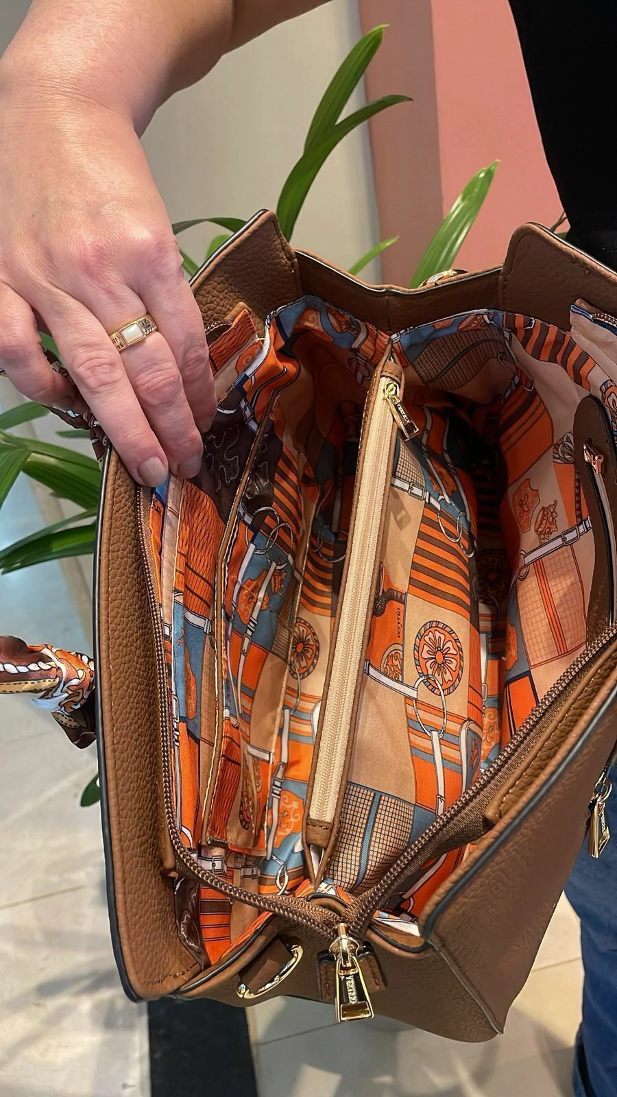 A alça transversal removível adiciona versatilidade, enquanto o destaque fica para o lenço trançado na alça, que dá um diferencial único à peça — podendo ser removido para variar o estilo.