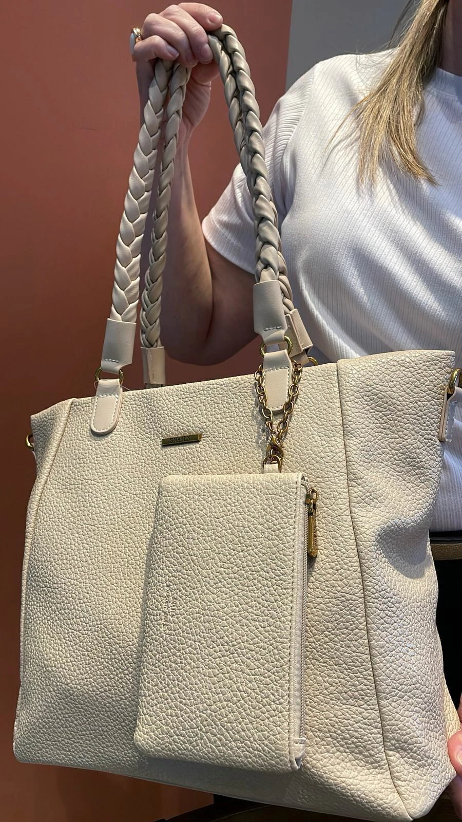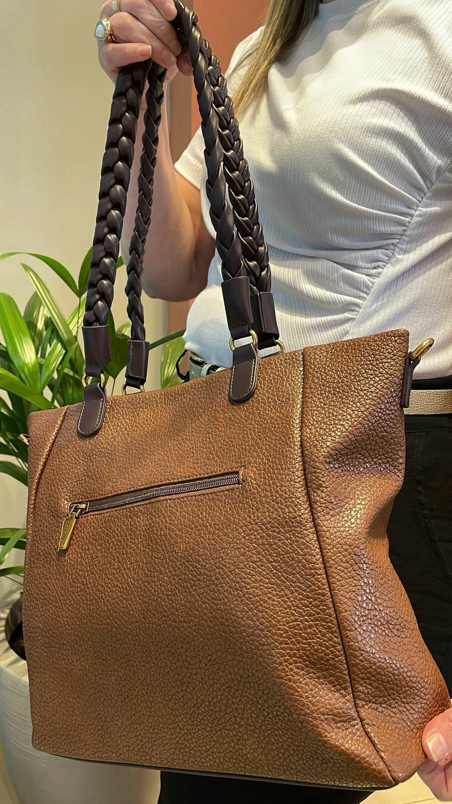 O grande destaque vai para a alça de ombro longa e trançada, que além de linda, proporciona um encaixe perfeito e confortável. O modelo conta com fechamento principal por zíper, divisória interna, bolso interno com zíper e outro aberto para itens menores, além do bolso externo traseiro com zíper que traz ainda mais comodidade.