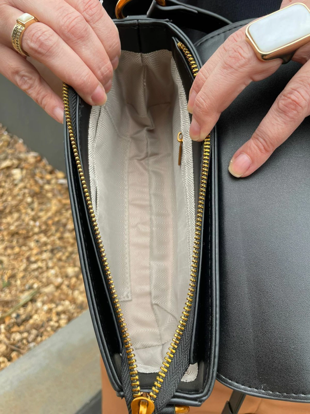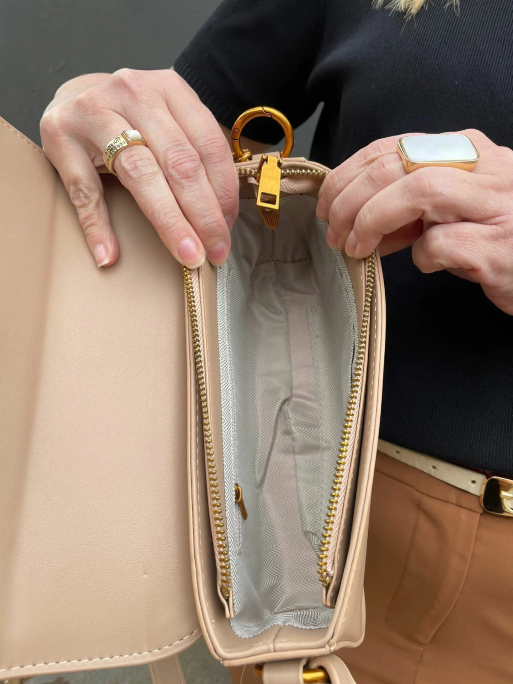 Fechamento duplo: aba com fecho no tom cobre + zíper principal