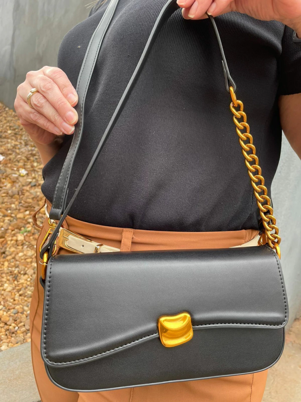 Alça curta com detalhe em correntaria puxada para o tom cobre, metal premium