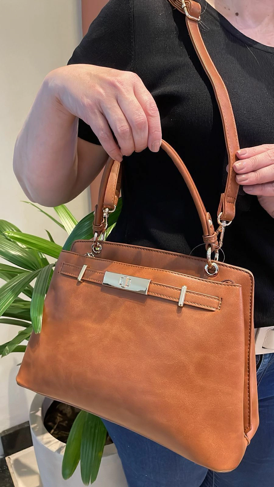 Na parte frontal, um detalhe discreto em metal dourado (linha premium que não oxida) dá ainda mais charme, e a alça de mão com argola delicada valoriza o estilo ao carregar a bolsa. Seu tom atanado é o grande diferencial, trazendo sofisticação e modernidade ao visual.