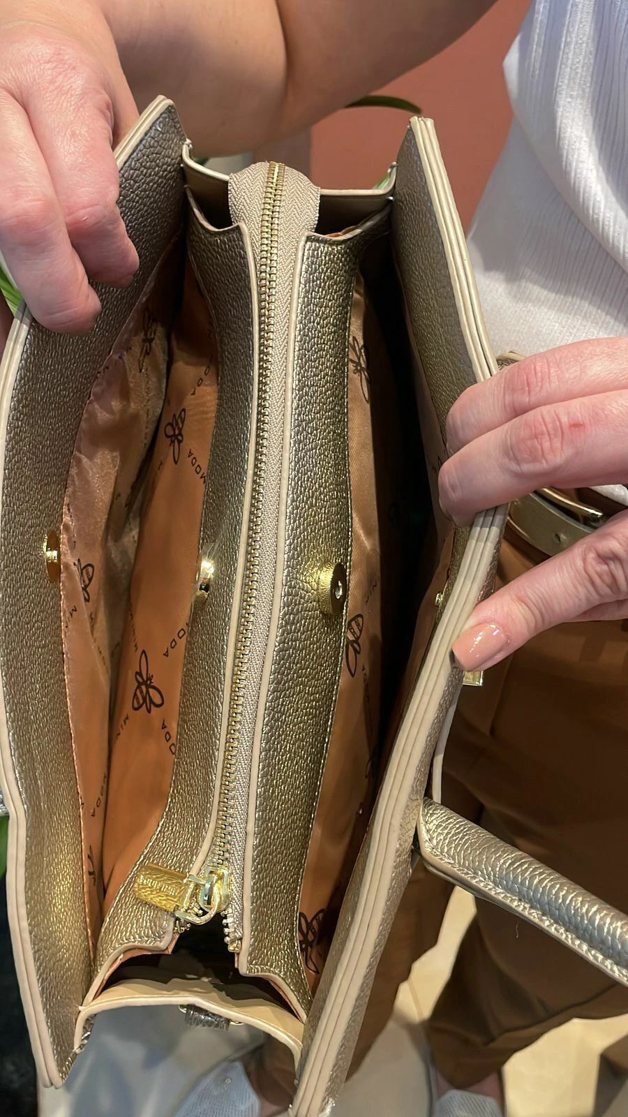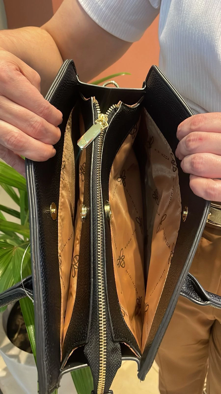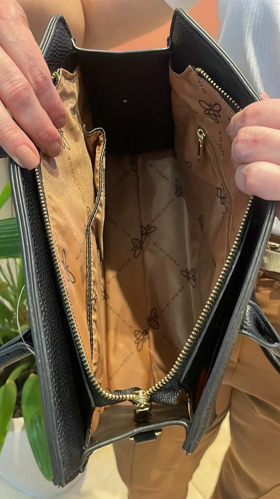 O espaço interno é um dos grandes diferenciais: são 3 divisórias funcionais – duas com fechamento em botão magnético e a principal com fechamento em zíper seguro. Dentro da divisória principal, você ainda encontra um bolsinho interno com zíper e um bolso aberto para itens menores. Para completar, a bolsa acompanha alça transversal removível, que oferece versatilidade para diferentes formas de uso.