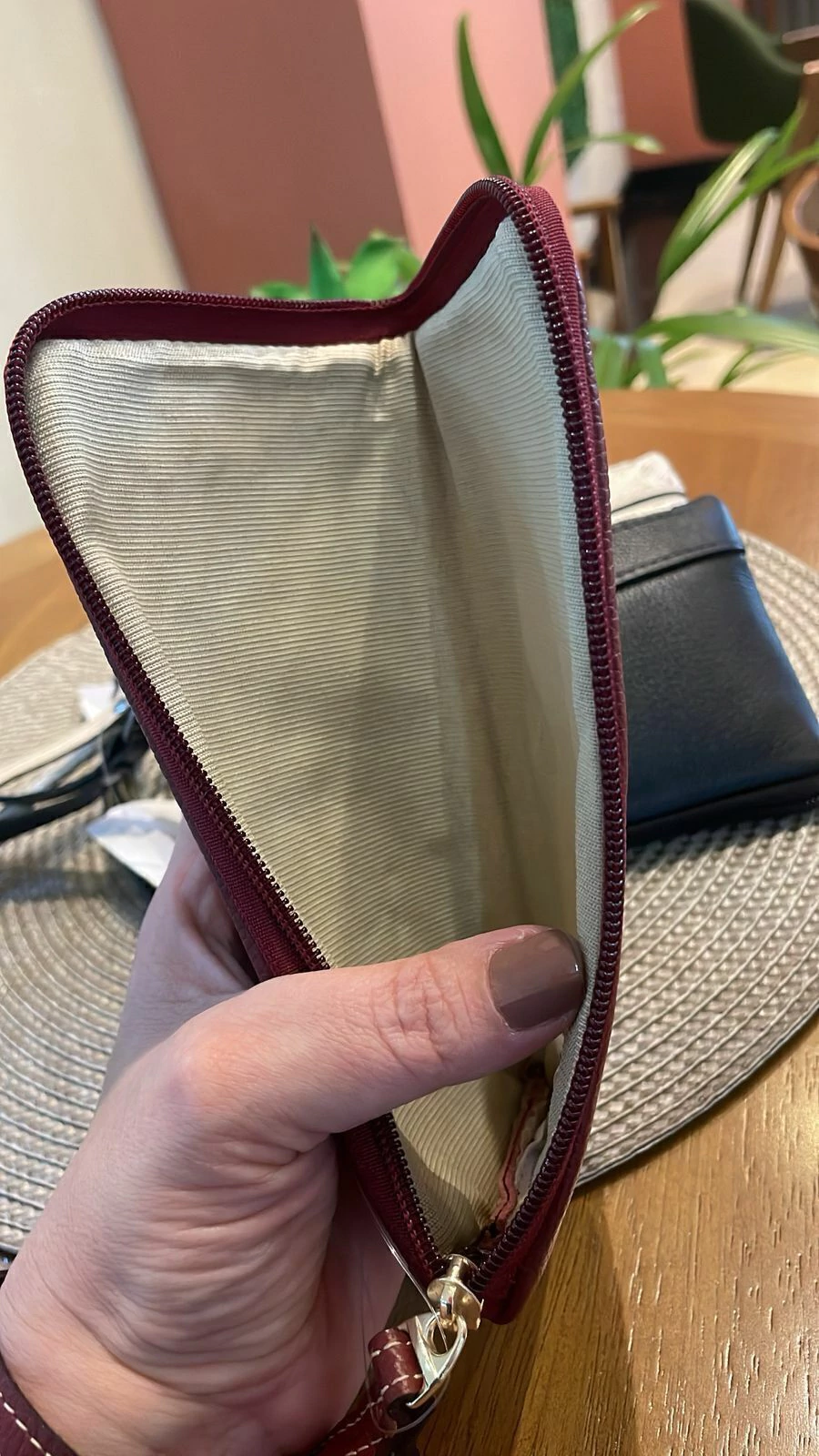 Confeccionada em couro legítimo, ela possui dois compartimentos com zíper: